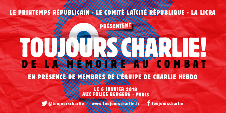 Participation à l’événement « Toujours Charlie, de la mémoire au combat » organisé par Le Printemps républicain, la LICRA et le Comité Laïcité République, avec le soutien de Charlie Hebdo, aux Folies Bergère à Paris le 6 janvier 2018.