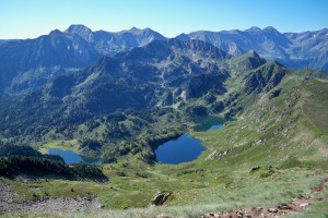 Vue prise du Pic de Tarbésou : Etang des Rabassoles, Etang noir, Etang bleu