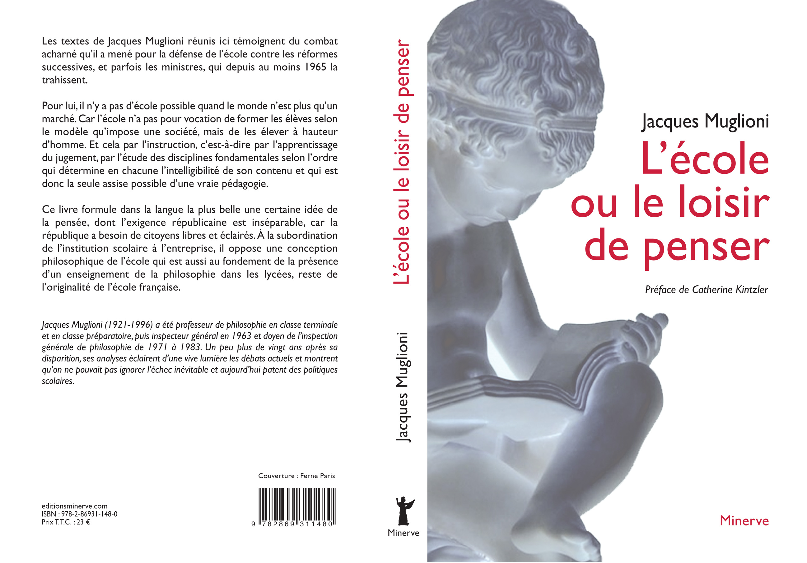 1 – Jacques Muglioni, L’école ou le loisir de penser, 2e édition revue et corrigée, préface de C. Kintzler, Paris : Minerve, 2017. En librairie le 14 novembre 2017.